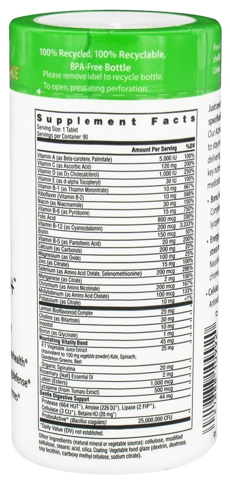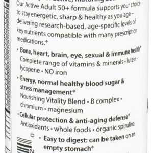 Rainbow Light Adulto ativo 50 + é uma nutrição livre de ferro especializada para adultos ativos e é compatível com muitos medicamentos prescritos. Active Adult 50 + oferece proteção multivitamínica baseada em pesquisa que vai além de valores mínimos diários 100 %, oferecendo proteção ideal para adultos com mais de 50 incluindo um B de alta potência complexo para energia, gerenciamento de estresse e saúde cerebral. O 1,000 UI de Vitamina D3 protege a força óssea, a função imunológica, a saúde do cólon e da mama. A luteína e o licopeno proporcionam uma potente proteção antioxidante adicional. Os probióticos para digestão são estéreis, além de enzimas e alimentos integrais para a saúde digestiva diária, regularidade e imunidade.