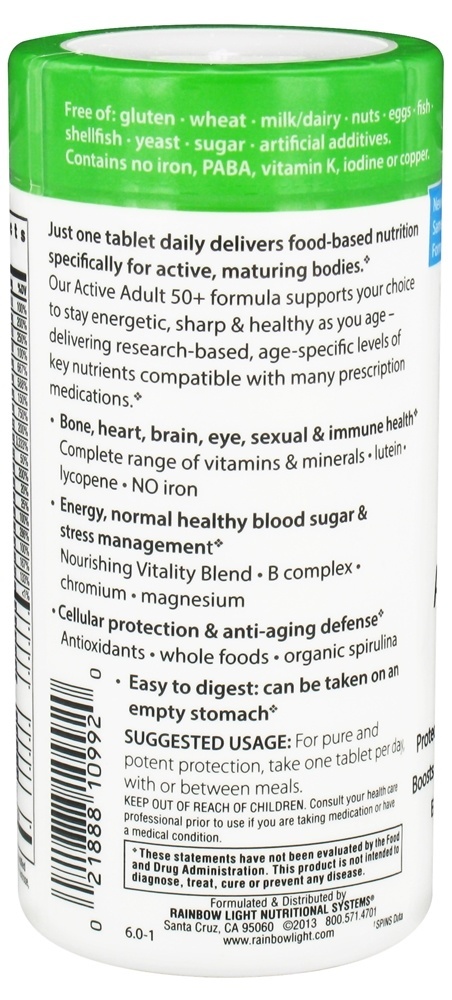 Rainbow Light garante que este produto é 100 % natural, livre de corantes artificiais, sabores, adoçantes, conservantes e outros aditivos desagradáveis frequentemente encontrados em produtos vitamínicos. Adulto ativo 50 + não contém açúcar, lactose / leite, trigo, glúten ou fermento. Rainbow Light tem SafeGuard testado Adulto ativo 50 + para contra-indicações comuns de nutrientes: sem adição de ferro para a maioria dos homens e mulheres na menopausa, PABA para medicação de sulfa, vitamina K para medicação de afinar o sangue, iodo para problemas de tireóide e cobre contra-indicado para pacientes com câncer e sobreviventes.