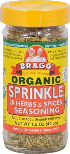 Bragg Organic Sprinkle is an original blend of 24 organic herbs and spices. Contains no additives, no preservatives, no fillers. Original formula by Paul C. Bragg, American’s Health Pioneer. A delicious seasoning for every meal, specially suited for healthy low sodium diets. Sprinkle adds flavor to most all recipes, meals and snacks: