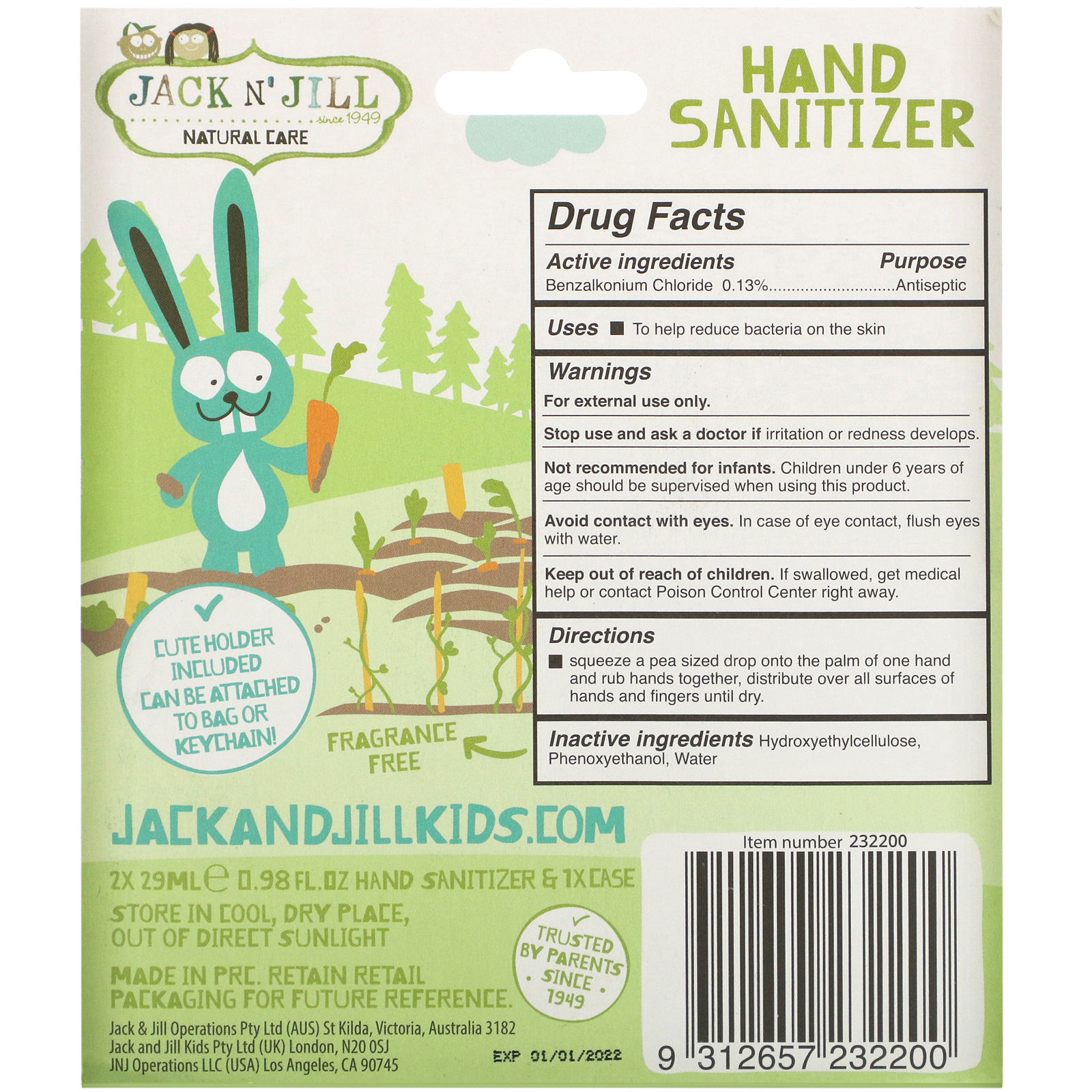 Jack n' Jill Hand Sanitizer Bunny é um produto ideal, disponível em 2 Pack de 0.98 fl oz (29 ml) cada, com fragrância agradável, ingredientes naturais e proteção eficaz onde comprar no Brasil, sendo perfeito para crianças e para o uso diário, garantindo limpeza das mãos, hidratação com aloe vera, e proteção extra em viagens, além de ter uma embalagem prática que pode ser levada facilmente, garantindo a saúde da família e a eficácia comprovada em eliminações de germes, proporcionando cuidados infantis que são seguros e agradáveis, sendo um item indispensável para ambientes públicos e para momentos de lazer, com um design divertido que faz o uso mais atrativo, ideal para a rotina diária e para proteção em eventos, com textura leve que não irrita as mãos e aroma floral leve que encanta, tornando-se um produto prático e funcional para a proteção em creches e eventos sociais, garantindo cuidados de saúde eficazes.