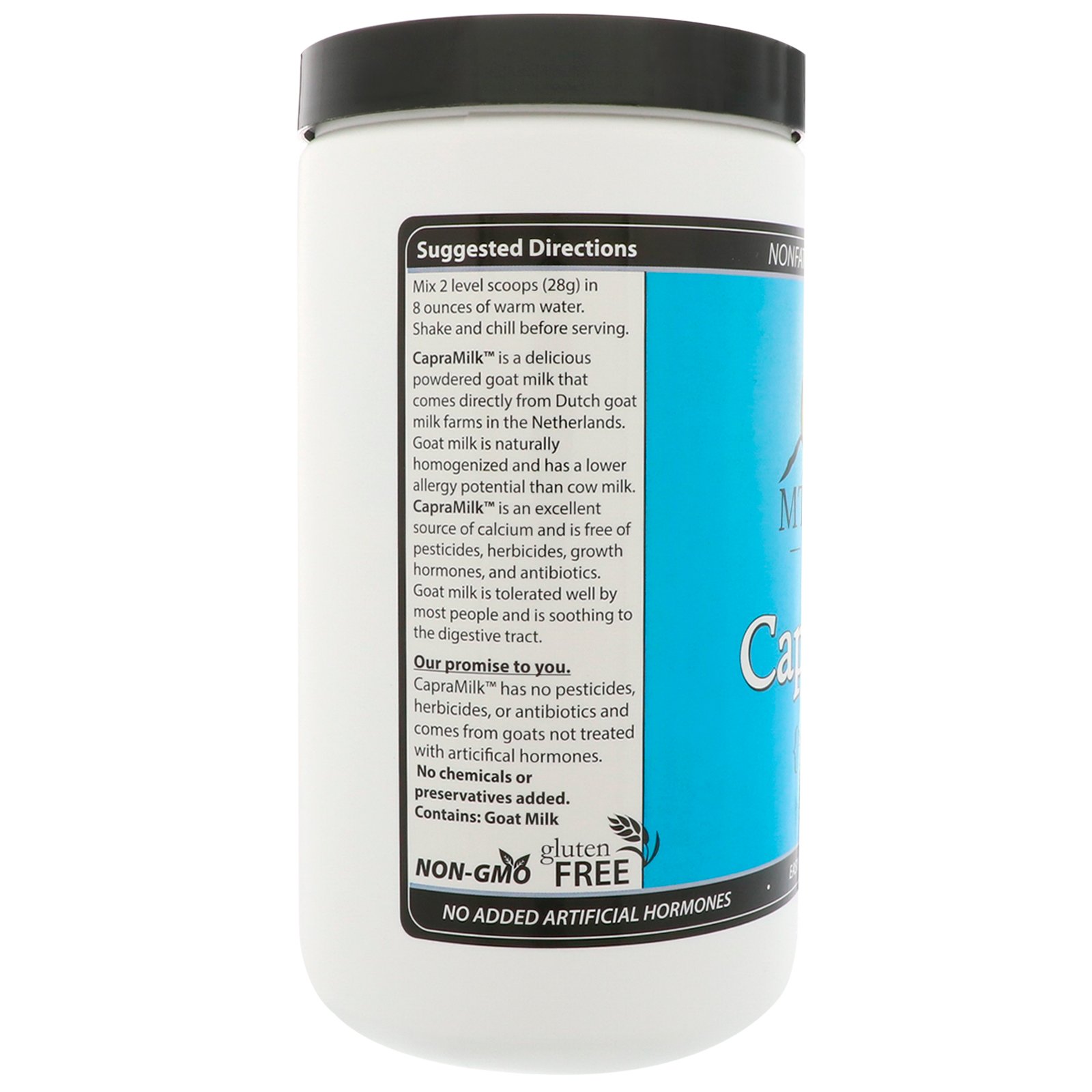 CapraMilk não tem pesticidas, herbicidas ou antibióticos e vem de cabras não tratadas com hormônios artificiais.