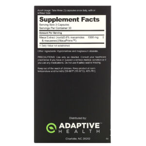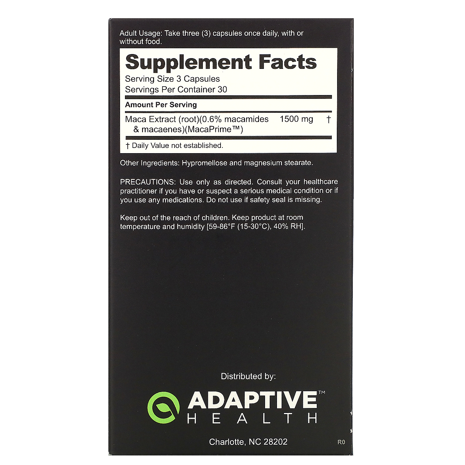“Serving Size: 3 Capsules Servings Per Container: 30 Amount Per Serving % DV Maca Extract (root)(0.6% macamides & macaenes)(MacaPrime™) 1500 mg † † Daily Value (DV) Not Established Other Ingredients: Hypromellose and magnesium stearate.”
