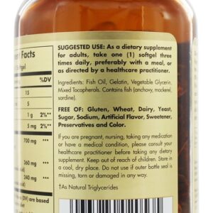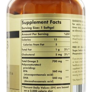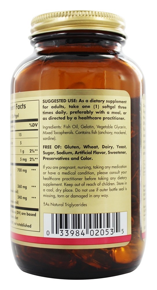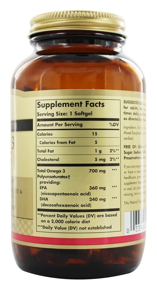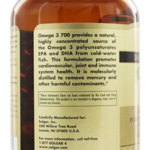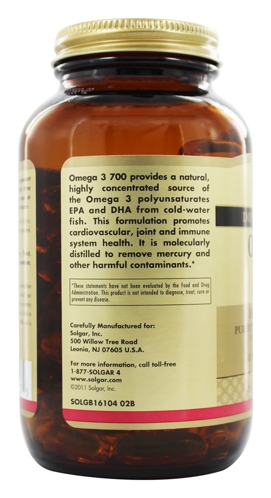 Solgar Omega 3 700 fornece uma fonte natural e altamente concentrada dos Omega 34 EPA e DHA de peixes de água fria. Esta formulação promove a saúde cardiovascular, articular e do sistema imunológico. É destilado molecularmente para remover o mercúrio e outros contaminantes prejudiciais.