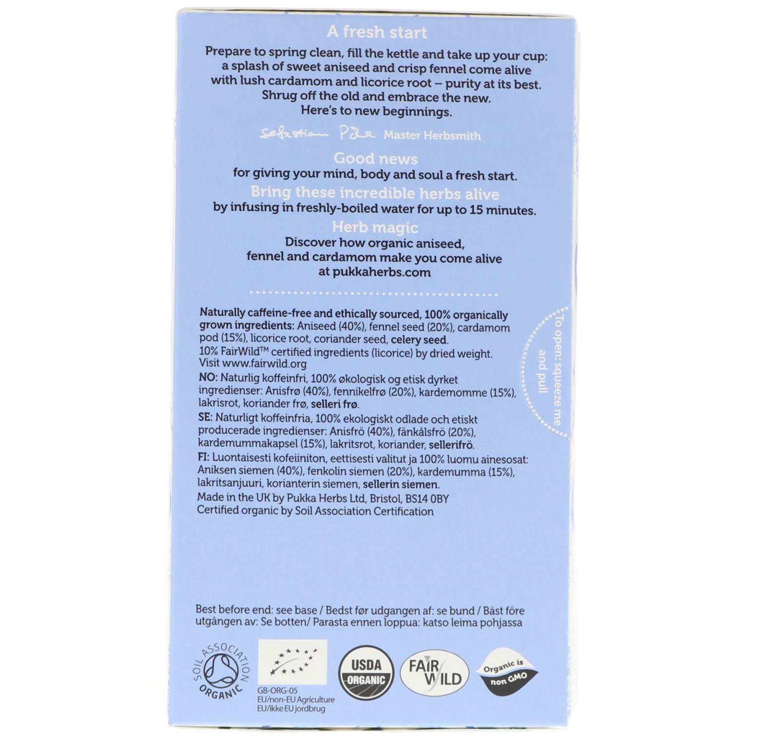 - Uma fusão limpa de anis, funcho e cardamomo orgânicos