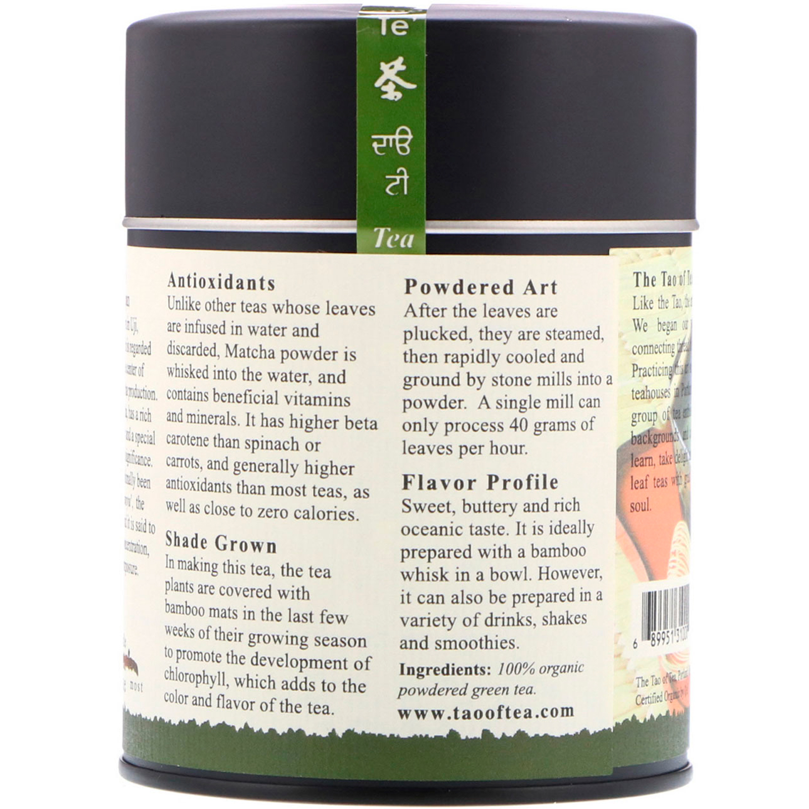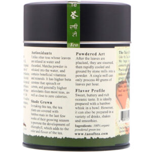 Ao contrário de outros chás cujas folhas são infundidas em água e descartadas, o Matcha em pó é misturado à água e contém vitaminas e minerais benéficos. Possui mais betacaroteno que o espinafre ou as cenouras e, geralmente, mais antioxidantes do que a maioria dos chás, além de quase zero calorias.
